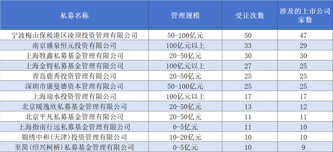 界面新闻梳理发现,截至7月17日,有12家私募出现在年内上市公司询价转让受让者名单上的总次数不少于10次,并且其中多数均为管理规模20亿元以上知名私募。